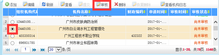 6、選擇“審核狀態”標注為“尚未審核”的單位,點擊該單位“組織機構”前的單選按鈕,再點擊