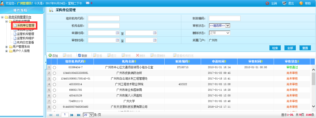 5、登錄後,在左側導航欄中選擇“采購機構管理”-“采購單位管理”,進入管理界麵如下圖。