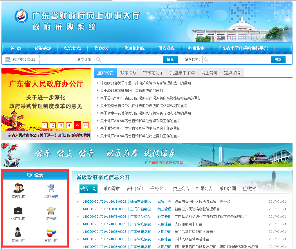 5、進入廣州市係統後,在頁麵左側找到“用戶登錄”功能欄目(如下圖紅色方框所示)