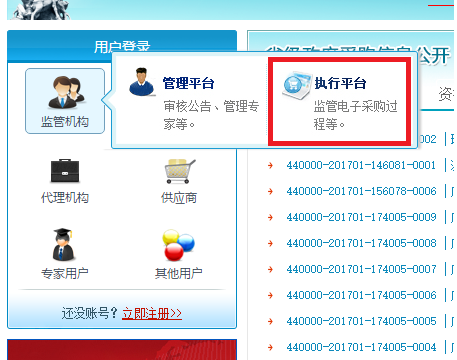 3、將鼠標置於“監管機構”圖標上,點擊“執行平台”圖標。或者直接點擊“采購單位”圖標。