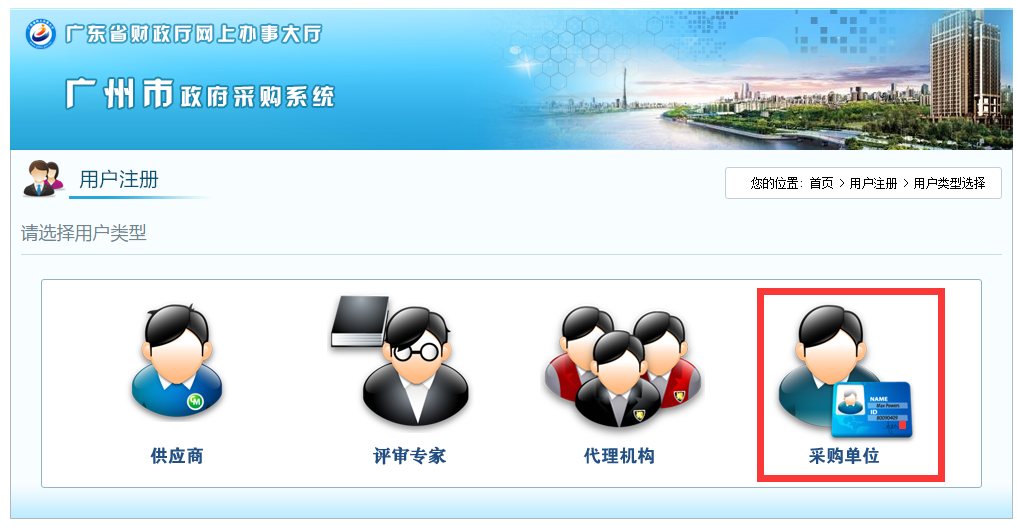 7、在新打開的“用戶注冊”頁麵中點擊“采購單位”圖標(如下圖紅色方框所示)。