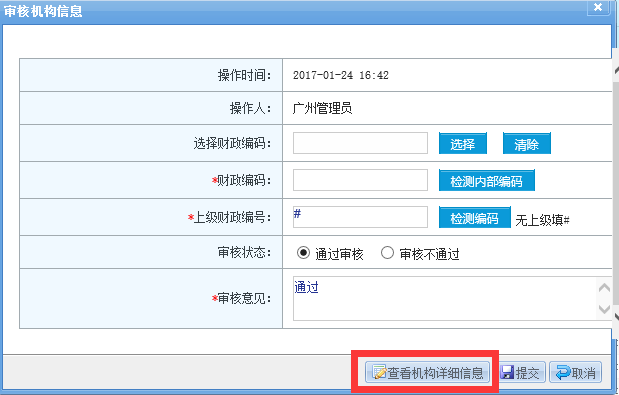 7、在審核中,“財政編碼”欄目請填寫市網采購賬號數字部分。可點擊“查看機構詳細信息”按鈕,已查看該單位市網采購賬號數字部分(如果單位在注冊資料填寫時是按要求填寫用戶名,可在圖示紅色標識位置查看)。