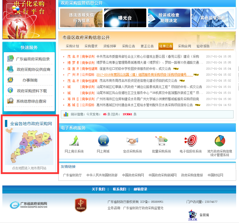 2、在頁麵左側找到“全省各地市政府采購網”功能欄目(如下圖紅色方框所示),點擊地圖圖片。